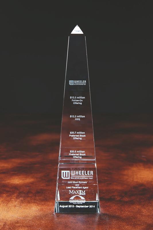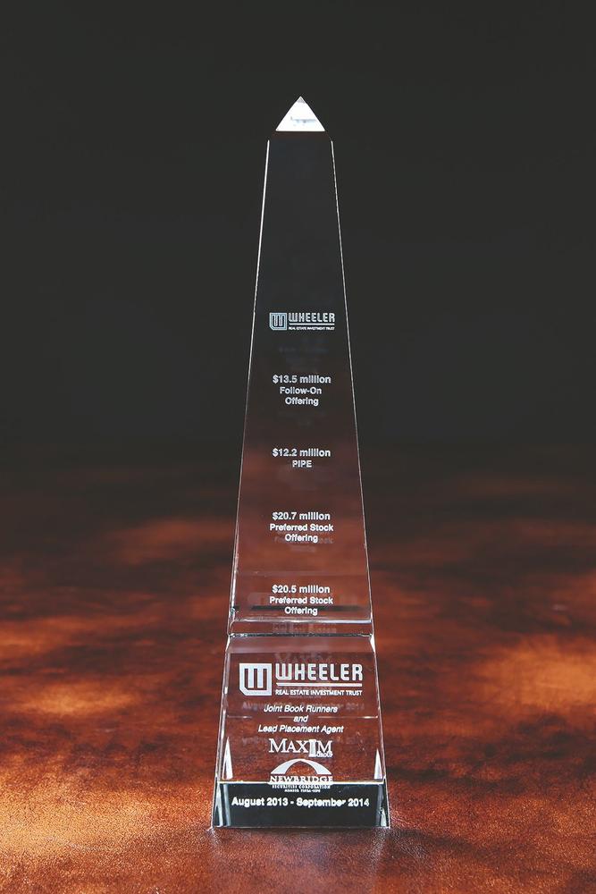 Top quality 3D laser crystal engraved grooved obelisk shaped award. The recipient of this monumental piece will be honored to receive it.