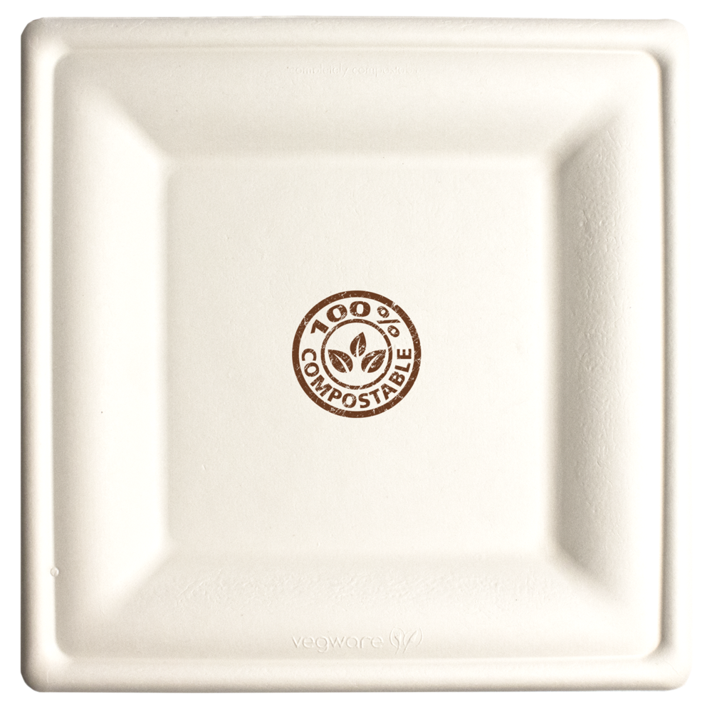 Stylish 10" square compostable dinner plates, great for hot or cold foods, and sturdy enough to load up! Tree-free and made from from bagasse, a recycled sugarcane fiber. Sleek white and embossed with the Vegware and compostable logos. Commercially compostable where accepted.