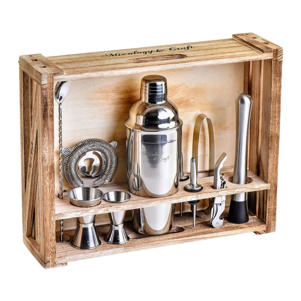 Our Stainless Steel wholesale 11-Piece Cocktail Set is anything but standard. Built for the long haul, whether in a professional bar setting or at home. All pieces are built from high-grade stainless steel. Logo can be custom pad printed or laser engraved on each item including the wooden display stand. Set includes: Rustproof 24 oz Cocktail Shaker – Including a built-in strainer, 2x Double-sided Jigger with markings, Mojito Muddler, Mixing Spoon, Hawthorne Strainer, 2x Liquor Pourers, Ice Tongs, Double Lever Corkscrew, Rustic wood stand, and Rustic rope. Rope can be used to hang display.