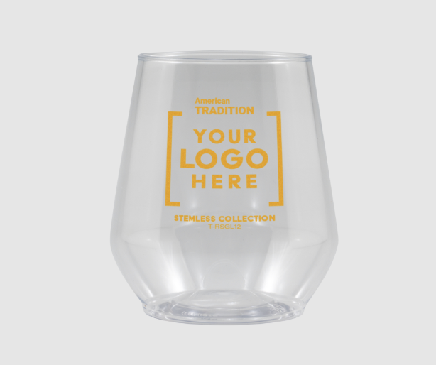 These stemless glasses will give your favorite vintage a modern update! A perfect touch of elegance for any occasion, this 12 oz. glass is made of clear shatterproof plastic and may be purchased blank or screen printed with a brand name, logo, or message. We can only print this item as 1 color but we can do a 2nd side or wrap imprint for no additional charge. We also offer free PMS matching and metallic and neon ink colors at no extra cost. This product is made and printed in the USA.