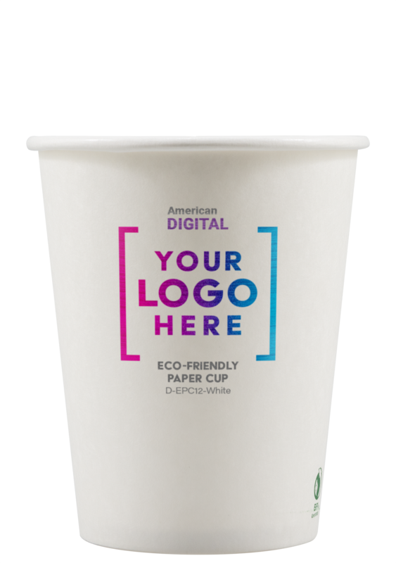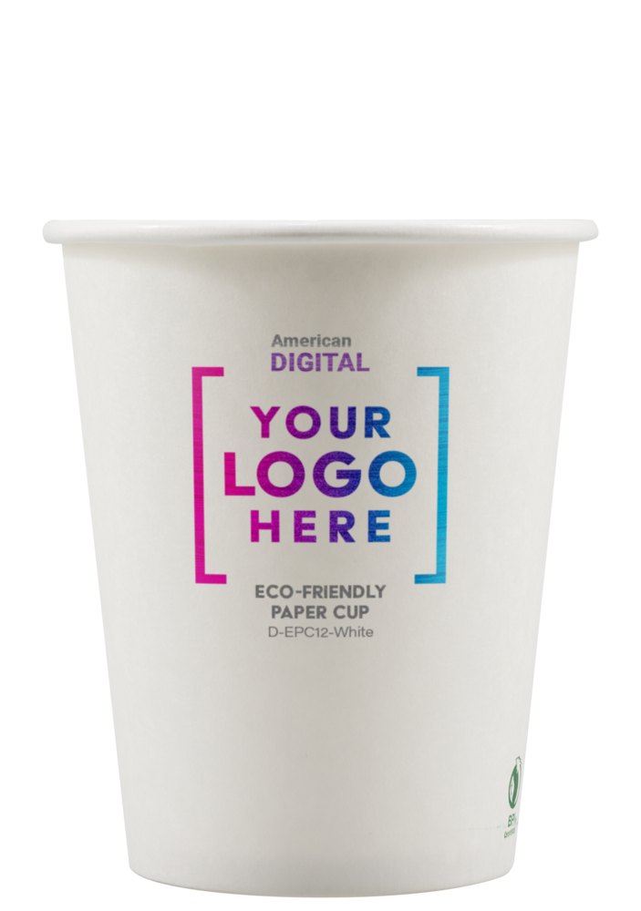 Our efficient and effective Eco-Friendly Paper Cups are designed for both hot and cold beverages! This eco-friendly white cup has a 12 oz. capacity with a PLA coated interior, and is made from renewable resources that are compostable and biodegradable. It can be digitally printed with 4-color process and there's no extra charge for 1 side or wrap imprint. Made and printed in the USA. An excellent choice for corporate parties, company picnics, large gatherings, tradeshows, hotels, and much more!