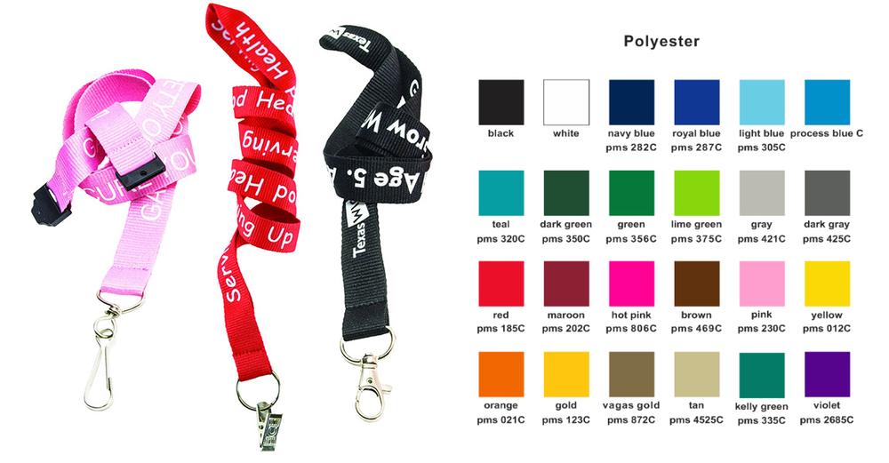 3/4" silkscreen flat premium Polyester lanyard. Available in many different stock body colors with free imprint PMS color match. Choice of 5 different free standard attachment. Upgrade your lanyards with premium attachment options.