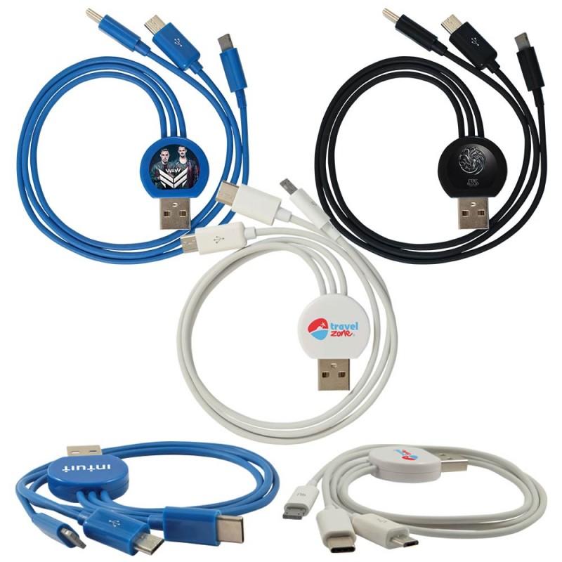 3 -in-1 Multi USB Charger – Multi USB cable features a USB Type-C connector, Samsung and an Apple connector.