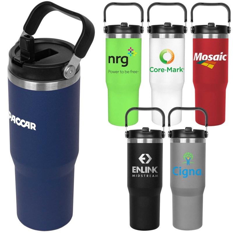 • Holds 30 ounces. • Durable powder coating. • Double wall, vacuum-insulated. • Screw-on lid features a straw and swivel handle.