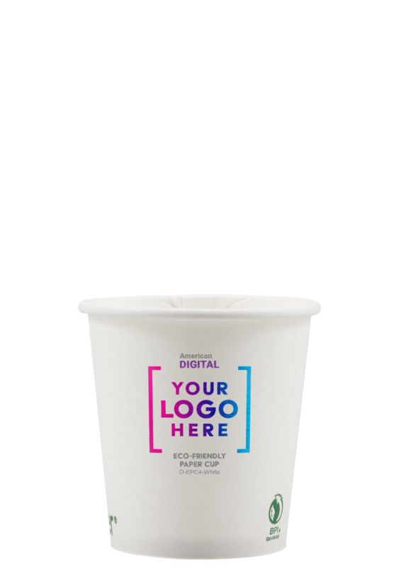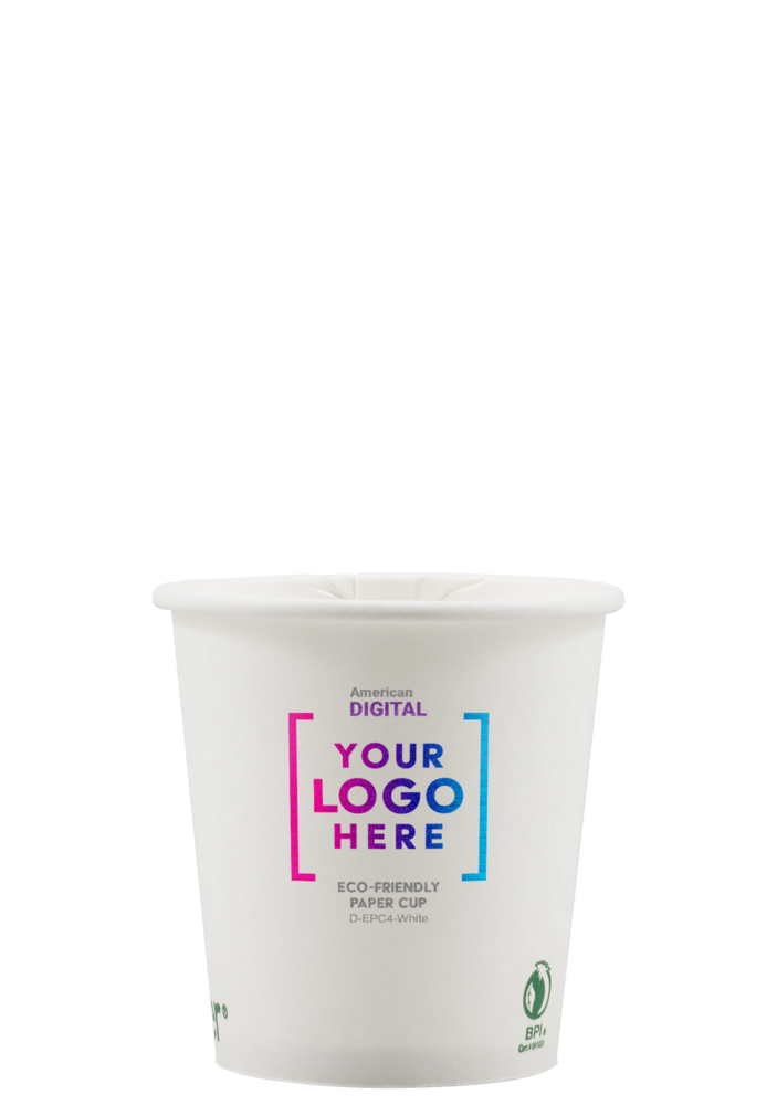 Our efficient and effective Eco-Friendly Paper Cups are designed for both hot and cold beverages! This eco-friendly white cup has a 4 oz. capacity with a PLA coated interior, and is made from renewable resources that are compostable and biodegradable. It can be digitally printed with 4-color process and there's no extra charge for 1 side or wrap imprint. Made and printed in the USA. An excellent choice for corporate parties, company picnics, large gatherings, tradeshows, hotels, and much more!