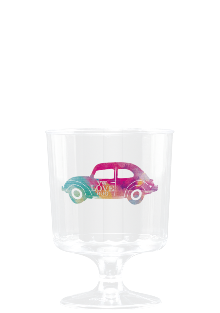 Let this footed wine cup lend an affordable elegance to any occasion! It's made from clear recyclable fluted plastic and features a 5 oz. capacity. Customize each one with a brand name, logo, or message using 4 color process digital printing. Price includes 1st side, 2nd side, or wrap imprint. White ink is available at no additional charge. This product is made and printed in the USA.