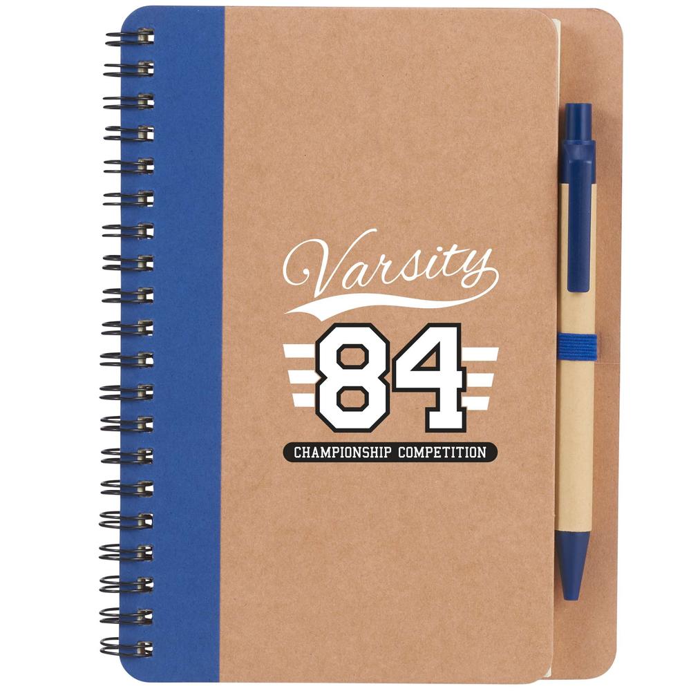 The 5'' x 7'' FSC Mix Eco Spiral Notebook with Pen features 60 ruled sheets of FSC® Mix cream paper, has a matching color elastic pen loop, and comes with a matching color ballpoint pen. Please note that pens are packed separately from notebooks. Through a partnership with 1% For The Planet, one percent of sales of all EcoSmart® products are donated to environmental nonprofits. Due to the nature of the material, there may be color variances.