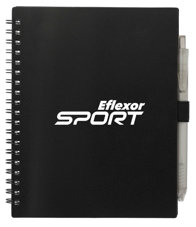 The 5.5” x 7” FSC® Recycled Spiral Notebook with RPET Pen features a 100% recycled polypropylene, hard cover with 70 sheets of white lined FSC®-certified paper. Black metal wire binding paired with black elastic pen loop. Includes 100% RPET barrel pen with black ink cartridge. Through a partnership with 1% For The Planet, one percent of sales of all EcoSmart® products are donated to environmental nonprofits. Note that pens are packed separately.