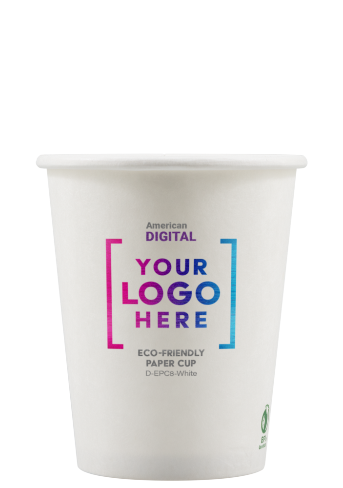 Our efficient and effective Eco-Friendly Paper Cups are designed for both hot and cold beverages! This eco-friendly white cup has an 8 oz. capacity with a PLA coated interior, and is made from renewable resources that are compostable and biodegradable. It can be digitally printed with 4-color process and there's no extra charge for 1 side or wrap imprint. Made and printed in the USA. An excellent choice for corporate parties, company picnics, large gatherings, tradeshows, hotels, and much more!