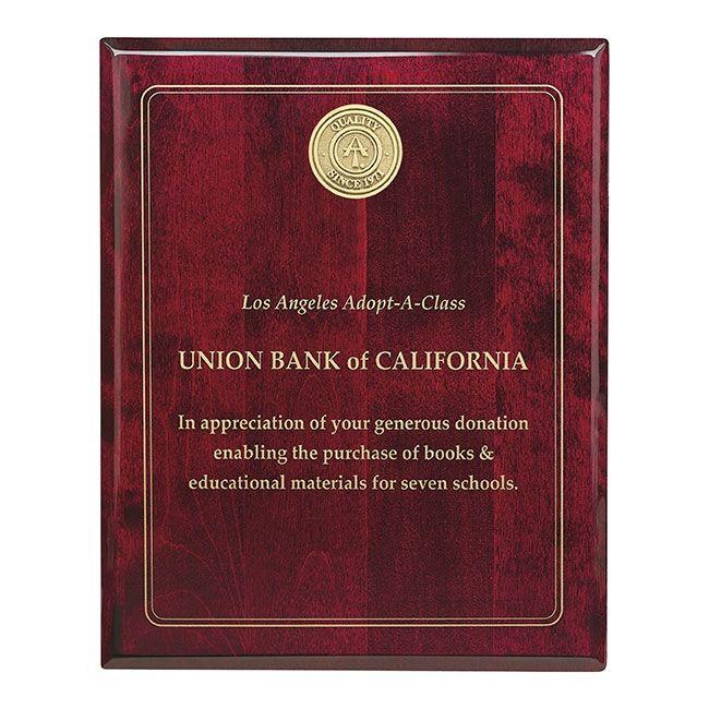 This rosewood plaque is a beautiful way to commend someone's achievement. It's shown with an optional custom crafted medallion. Each piece is made of a naturally occurring material, slight variations may be present.