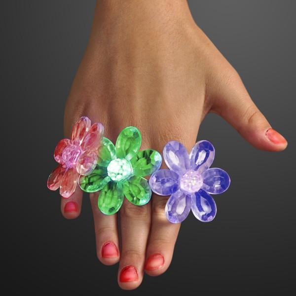 Acrylic Flower Rings LED Jewelry is lit up & lovely! Dress up your digits with slow color changing shining jewel flowers. Petals are transparent & crystal cut, so they reflect light beautifully. Flower LED Jewelry's soft mood lighting is sure to get you compliments. To activate your Light Up Flower Ring, just press button on back. LEDs slowly rotate from 1 color to the next. Ring band is comfortable silver plastic. Acrylic Flower Rings LED Jewelry comes with 2 replaceable batteries.