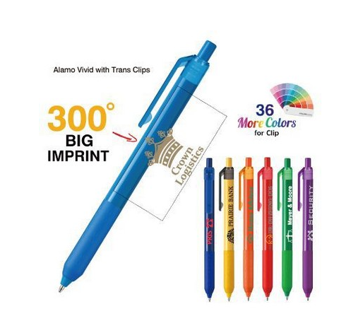 BIG Imprints happen here. Alamo barrels feature a BIG 300° imprint area for MAXIMUM imprint messaging. Set up for your BIG Imprint is included. Choose from 23 different colors of XL Clips, or 37 different colors of standard clips. The pure black that was used to be known as "Alamo Onyx" is now part of the Vivid family! Complies with Prop 65. 6" L x 0.4" W x 0.6" H. Screen Printed, Full Color. 2 1/4" W x 1" H on center (Screen Print). Second location: 1 1/2" W x 3/8" H on clip (Full Color). Price includes 1 color, 1 side, 1 location.