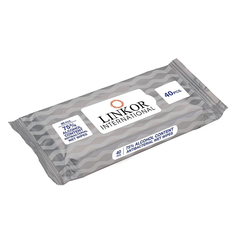 Resealable pack of 40 antibacterial wet wipes are 75% ethyl alcohol based and meet FDA requirements for personal use.