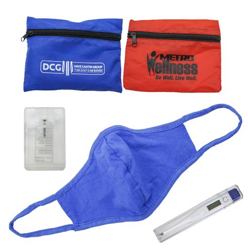 This 3-in-1 safety kit comes packed in a zipper pouch and includes a reusable 2 ply cotton mask, 0.67oz liquid hand sanitizer card (62% alcohol), and a digital thermometer. Imprint your company name and logo on the pouch, mask, sanitizer, and/or thermometer to promote schools, colleges, corporate offices and more. Help prevent the spread of COVID-19. Quantity ordered must be in increments of 150 pcs.