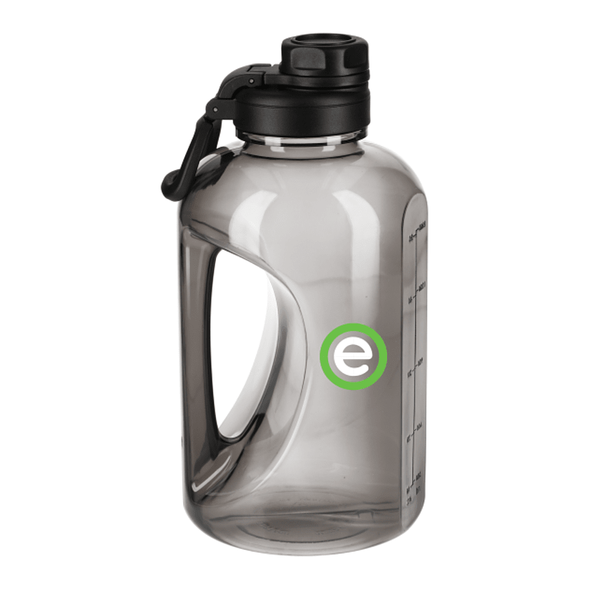 The durable Cena Half Gallon Recycled Sports Jug holds 64 ounces! That is plenty of water to stay hydrated at the gym, in the car or at the office. This sports jug features a handle integrated into the jug so you can refill and drink with one hand, plus the wide top opening allows you to add ice cubes and refill easily. The durable recycled lid includes a controlled flow drinking spout with a sturdy carry handle. Easily track how much you drink using the ounce measurements on the bottle. This sports jug is made from 100% recycled Polyethylene Terephthalate Glycol (rPETG) and has a 100% recycled polypropylene (rPP) lid and carry handle. Handwash only.