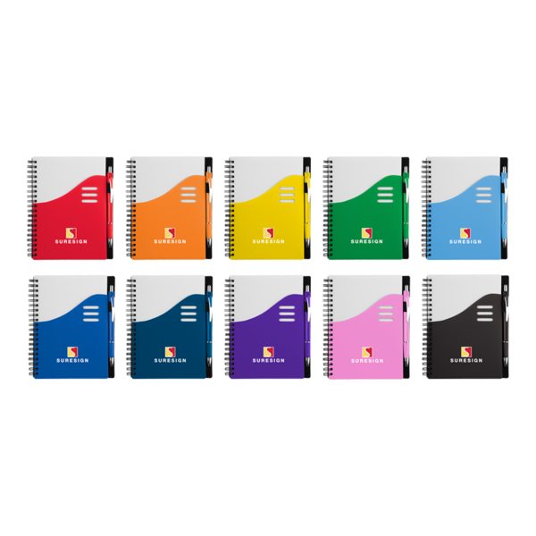 Spiral bound 70 sheet lined notebook; white cover with large contrast color front pocket with die-cut detail; one pocket on inside front cover; matching color ballpoint pen included.