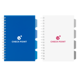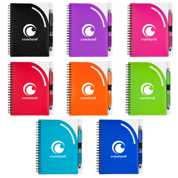 Spiral bound 70 sheet lined notebook; white cover with large contrast color front pocket with die-cut detail; one pocket on inside cover; matching color ballpoint pen.