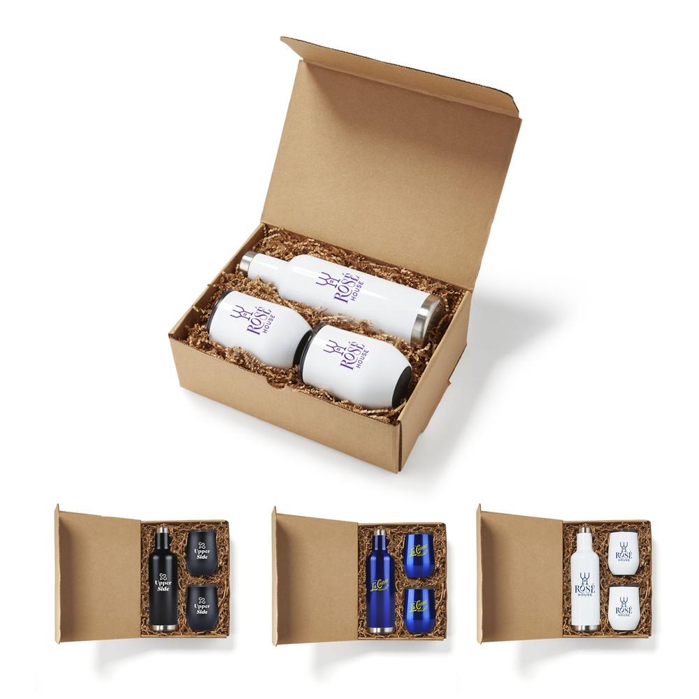 Toast the success of your brand with our Deluxe Wine Tumbler Gift Set. Add your name, logo and marketing message before handing it out to your target audience for maximum brand exposure. This set is the perfect gift for your favorite entrepreneur, executive or anyone to show off their personality and the brand they love! Each set includes JK-5852 (25 oz Stainless Steel Vacuum Insulated Wine Bottle) and 2 pcs. of JK-5857 (12 oz Stainless Steel Wine Mug). All items included comes with one color imprint. Includes mailer box and shred.