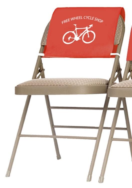 Draped / flat style fabric chair advertising headrest cover with elastic attachment. Custom sizes available to fit any chair back.