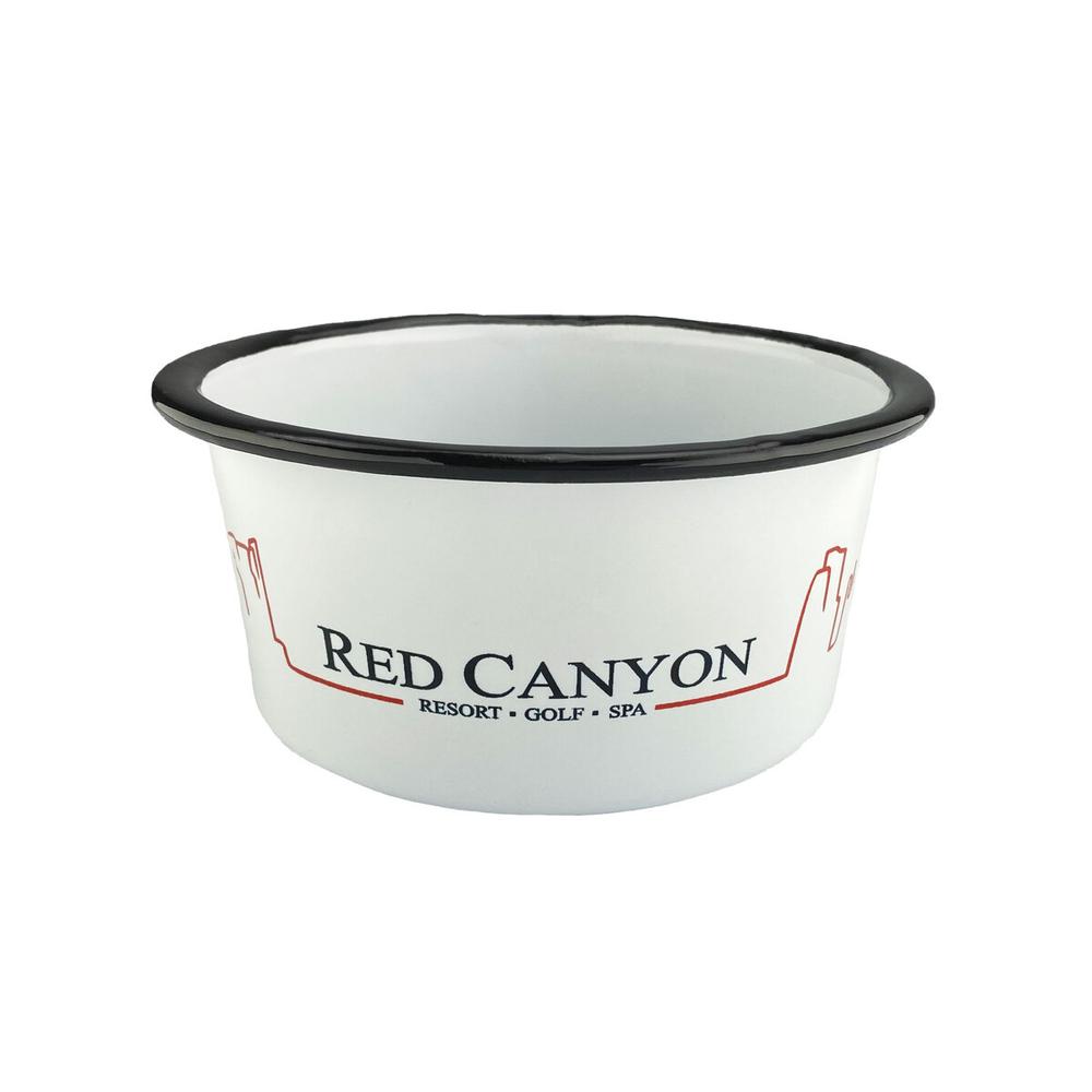Enamel-coated steel bowl holds 25-30 oz. and features a hand painted black rim.