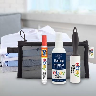 Tide to Go Instant Stain Remover, Downy Wrinkle Releaser and lint roller, in black mesh travel bag with sewn-in logo tag. Logo on tag is either printed or embroidered depending on logo type. Mesh bag dimensions: 7.5" x 4.125". 7.5" W x 4.125" H x 1.5" D