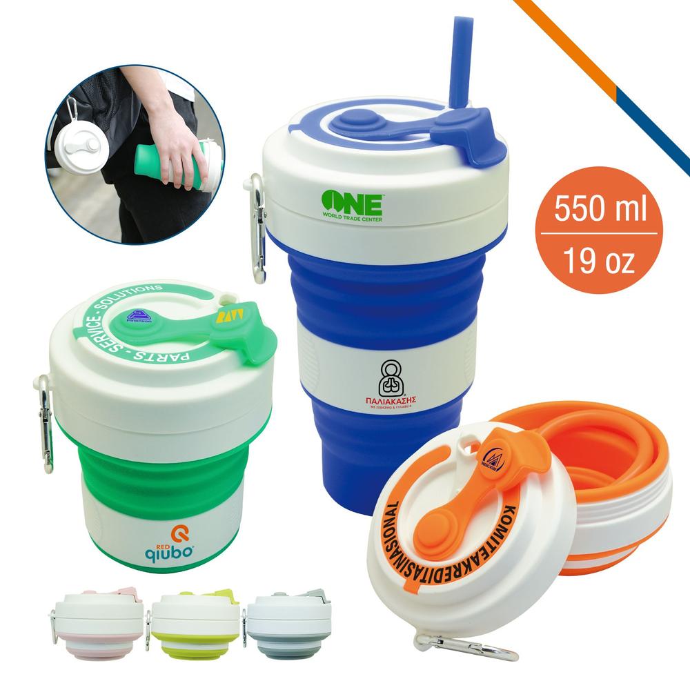 You'll love how little space this lightweight fascinate travel mug is. It is so collapsible and compact that takes up less room in your pocket, backpack, and they fit in your car or camping cup holder as well. The Ideal Travel Companion, it's all you need for a drink on the go! Portable reusable cup includes reusable lid and metal hook, Leak-proof Scald-proof for all cold and hot drinks. Made of food grade high quality silicone, mold proof and does not contain BPA, easy to clean and is freezer and dishwasher safe. Multiple imprint location can fit any shape of logo with any color you want. FDA certified Mug volume: 550ml max size, weight 202g