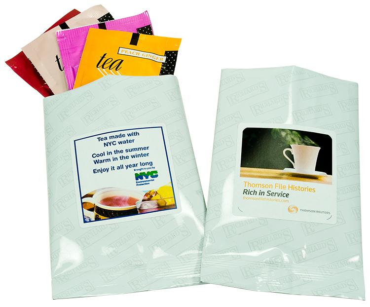 Each white foil package contains four delicate tea varieties: wild raspberry, peach ginger, cranberry infusion & English Breakfast. Each tea bag is individually wrapped to prevent mixing of flavors. Individual imprinted tea bags also available.