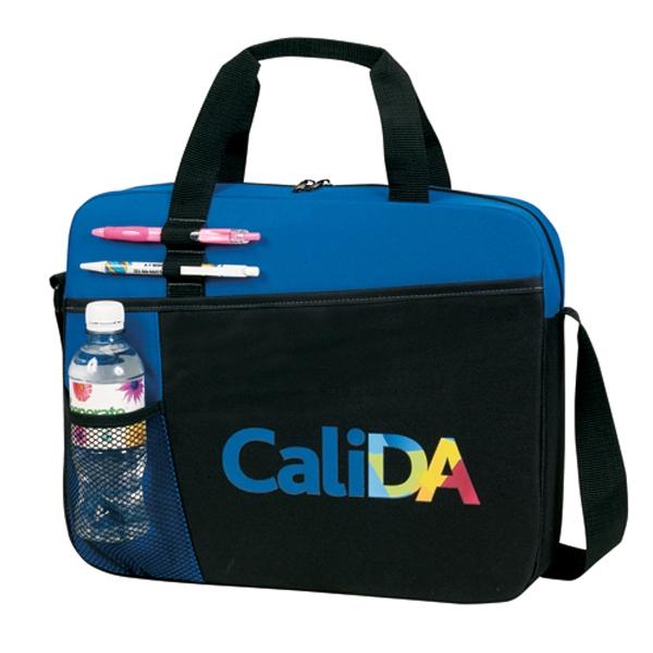 Combine clean geometrical design with everyday tech utility and add your brand to something that any officer worker or commuter will appreciate. The 15" x 12" x 3" Geometrical Crescent Briefcase features 600 denier PVC backed polyester, a main zippered compartment, a diagonal open front pocket and front mesh water bottle holder, a rear back ID badge holder, a webbing adjustable shoulder strap with 2 pen loop attachments and the comfort and convenience of polyweb handles.