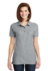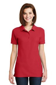 6.5-ounce 100% combed ring spun cotton double pique knit Missy contoured silhouette Heat transfer label Contoured welt collar and welt cuffs Rolled forward topstitched shoulders 3-button placket clean-finished placket with reinforced bottom box Dyed-to-match buttons Side seamed with side vents Double-needle bottom hem