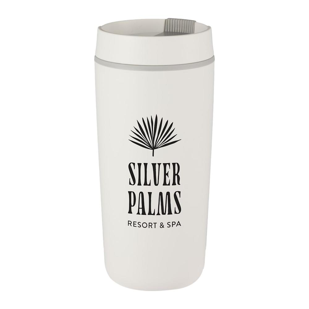The Bullet Grande Tumbler has a 16oz capacity and an air insulated design to help keep your favorite beverages hot or cold in any environment. It is made of 100% recycled plastic. It features durable double-wall construction and comes with a press-on lid that has a slide-lock opening for easy drinking. This Grande Travel Tumbler 16oz is hand-wash only. 3.36" D x 3.36" W x 8.39" H