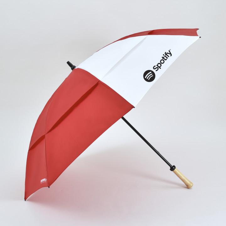 Greenbrella fabric 51% RPET… made from recycled plastic bottles Enhanced FlexTech™ fiberglass frame constuction Unique design with two white panels Superior wind vented design allows for great air flow Safety glide pinchless opening mechanism Natural wood handle is great to laser engrave Imprint area: 10" x 6" 1 color 1 panel print included Powered by our patented RainAlertz app- This umbrella will tell you when it's going to rain… REALLY!