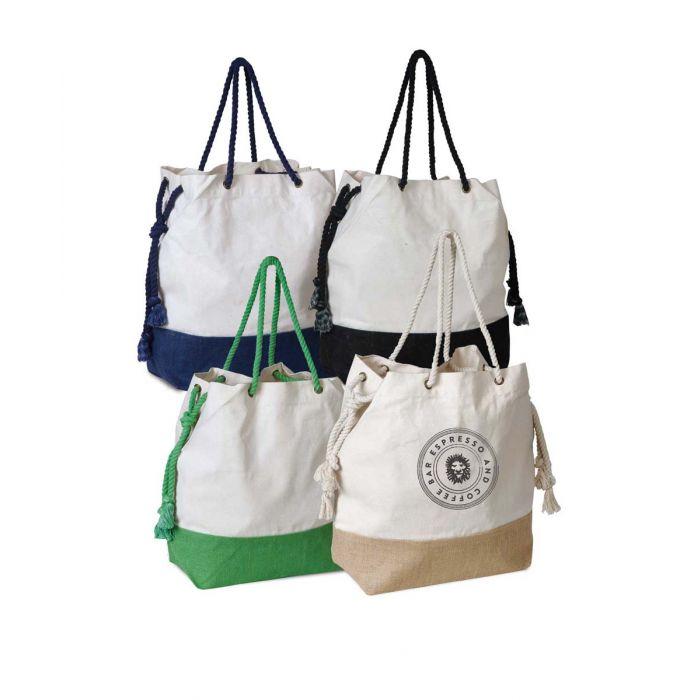 This is a jute/cotton drawstring tote bag with contrast border and rope handles. This trendy bag comes with a variety of colors. It is soft, comfortable, ecofriendly and ensures environmental sustainability.