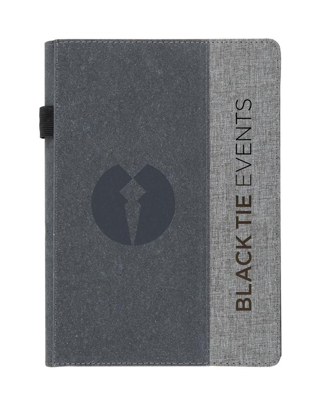 Refillable textured hard cover made with post-consumer recycled leather accent, vertical recycled woven fabric accent, and can be refilled as needed. Includes perfect bound book with 80 sheets of ruled recycled filler, black satin ribbon bookmark and elastic pen loop on spine of cover. Gets either a 1 color foil imprint on the linen fabric or a deboss imprint on the leather portion of front cover. Imprint area is 16"sq or less, no bleed. Imported book, decorated in the USA.