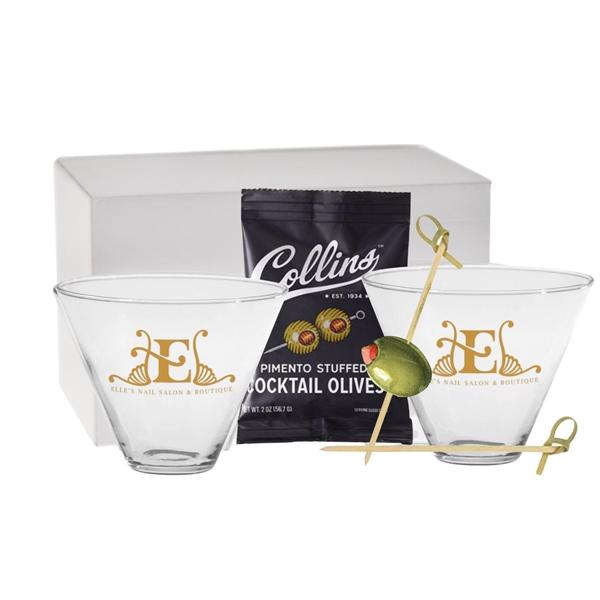 Set of stemless martini glasses branded with your logo, package of cocktail olives and wooden cocktail pics all kitted inside white gift box. Full color box label, card insert and drop shipping available. We'll customize a cocktail kit to fit your budget and event needs.