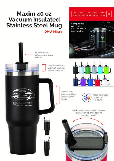 Available in 11 colors with matte finish – Black, white, grey, navy, royal, aqua blue, cloud blue, red, lime, green, purple. Double-wall vacuum insulated. Unique swivel top drink opening. Clear screw-on lid with high-wall leak resistant engineered for left or right-handed use. PP handle. PP Straw included