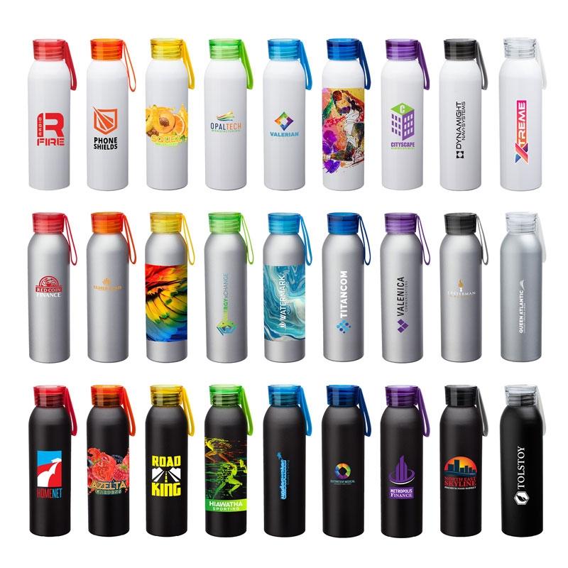 Our Metis 22 oz. aluminum bottle is BPA free, FDA compliant and comes with your choice of black, silver, or white body and various colored translucent screw top lids. Each top has a silicone ring for a tight seal and a matching colored silicone strap for easy carrying.