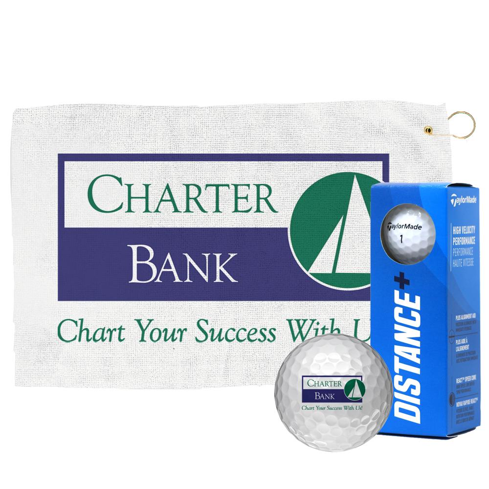 Kit includes three TaylorMade Distance Plus golf balls and a 24" x15" full-color microfiber golf towels. Dye sublimation decoration allows for vivid, high-resolution images that won’t fade with washing. Soft and absorbent, this towel it is tough on dirt, mud, sand, and grass, includes a hook and grommet!