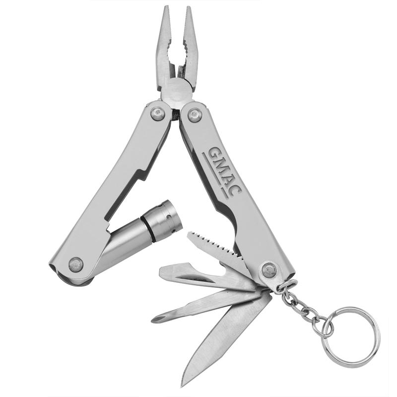 Our switch-style Pocket Tool comes with a bottle opener, knife, screwdriver, pliers, and an LED flashlight. Perfect for camping trips. Nylon pouch with Velcro clasp and belt loop included.