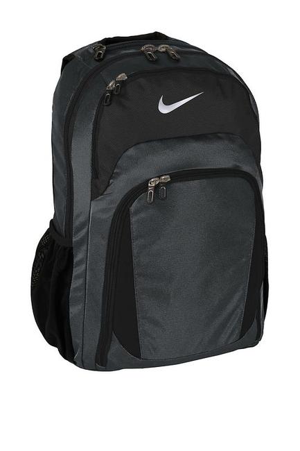 A sporty backpack to get you from home base to work and back. Padded sleeves protect valuable technology and the contrast welded Swoosh design trademark says it's pure Nike Golf. 150 x 300D polyester/1 680D ballistic nylon 150D polyester lining Integrated grab handle Curved padded shoulder straps Zippered main compartment Front zippered pockets with organization panel Side mesh pockets Tablet sleeve dimensions: 9.5 h x 8.75 w Laptop sleeve dimensions: 18.25 h x 13.25 w x 1.25 d; fits most 17 laptopsDimensions: 18.25 h x 13.25 w x 5 d; Approx. 1 209 cubic inches *Bags not intended for use by children 12 and under.