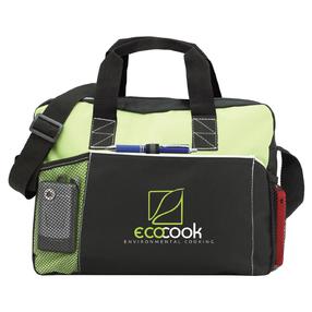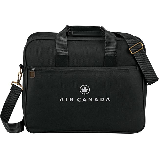 Fully-opening zipper on main compartment. Functional organizer for phone, business accessories and files. Unique carry option on back for umbrella or presentation tube. Detachable, adjustable shoulder strap.