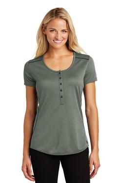 OGIO delivers an out-of-this world henley with micro textures and feminine styling. 4.4-ounce 100% polyester heather double knit jacquard with stay-cool wicking technology OGIO heat transfer label for tag-free comfort Scoop neck Set-in open hem sleeves Metal OGIO bar on left sleeve Coverstitching throughout 5-button placket with debossed O dyed-to-match buttons Rubber O heat transfer at hem Slight drop tail hem