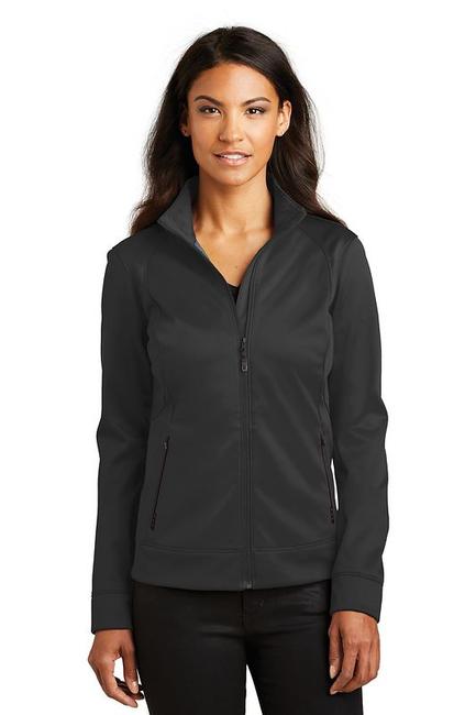 This jacket has an on-trend fit and an ultra cool vibe thanks to its flattering length curved drop tail hem princess seams and welding details. It also offers very good water protection. 100% poly interlock bonded to 6.5-ounce 100% poly microfleece 3000MM fabric waterproof rating 3000G/M2 fabric breathability rating Contrast color inner fleece Zip-through cadet collar O heat transfer at center back Front and back princess seams Reverse coil zipper with rubber OGIO zipper pull Front zippered pockets with welding details and matte black O zipper pulls Open cuffs OGIO woven badge on left side seam Curved drop tail hem