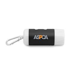 NO MORE FUMBLING IN THE DARK ON NIGHTTIME WALKS WITH YOUR POOCH! DUO-COLORED BONE-SHAPED WASTE BAG CONTAINER (15 BLACK WASTE BAGS INCLUDED) WITH BRIGHT LED FLASHLIGHT (TWIST ON/OFF SWITCH) AND ALUMINUM CARABINER. TAKES (3) LR1130 BATTERIES (INCLUDED).