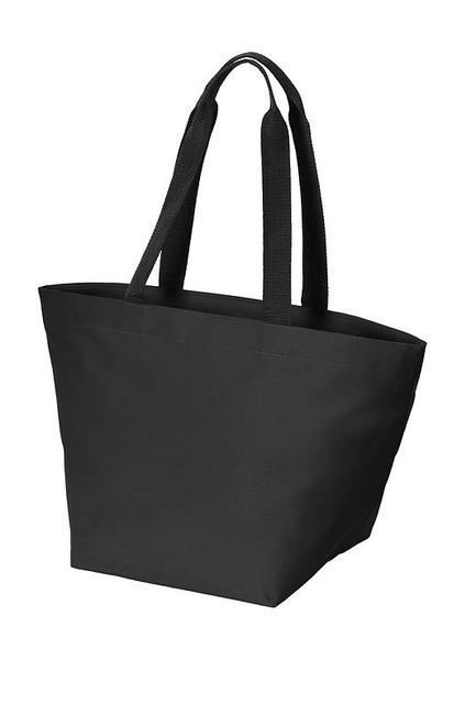 A zippered top closure and a squared bottom makes this European-inspired tote perfect for shopping travel work school and more. 600 denier polyester canvas Over-the-shoulder length web handles Interior hanging pocket with hook and loop closure Dimensions: 12 h x 19.5 w (top) 10 w (bottom) x 10 d Approx. 1 112 cubic inchesNote: Bags not intended for use by children 12 and under. Includes a California Prop 65 and social responsibility hangtag.