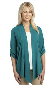 Top off your look in style with this shrug that's equally flattering paired with a skirt or jeans. 4.4-ounce 62/33/5 poly/rayon/spandex Button tab on sleeves Shawl collar Sloping front hem