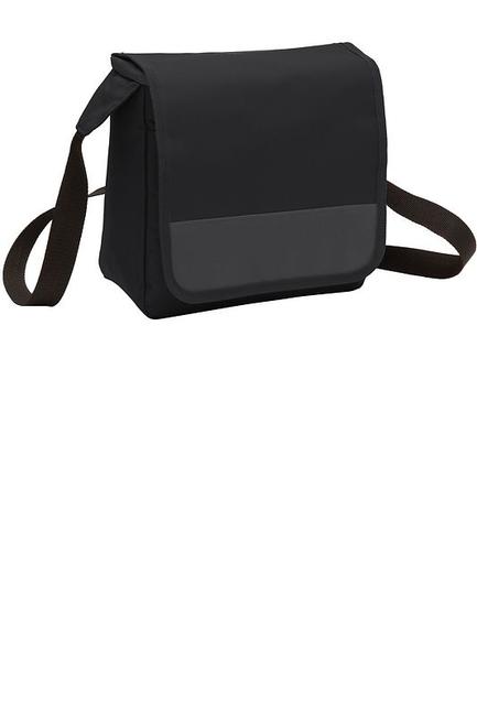 A commuter's must-have this versatile cooler can hold lunch work essentials a tablet or books. It can be worn over the shoulder or across the body.600 denier polyester canvas Adjustable webbing shoulder strap Padded insulated interior compartment Secure front flap with hook and loop closure Main compartment drawstring closure Interior elastic beverage holder Under flap and rear slip pockets Dimensions: 8.75 h x 9.5 w x 5 d; Approx. 415 cubic inchesNote: Bags not intended for use by children 12 and under. Includes a California Prop 65 and social responsibility hangtag.