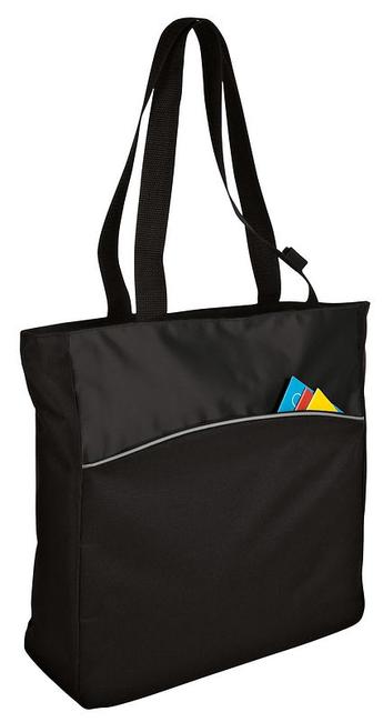 This tote has simple practical style and budget-friendly value.600 denier polyester with 420 denier dobby contrastMain compartment with zippered openingCurved exterior zippered pocket with decoration areaWeb handles with elastic accessory or pen loops Dimensions: 13.75 h x 14 w x 4.25 dNote: Bags not intended for use by children 12 and under. Includes a California Prop 65 and social responsibility hangtag.