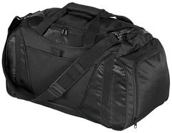 This duffel has it all when it comes to value style and organization. 600 denier polyester with polyester dobby contrastD-shaped zippered entry for easy accessFront pocket with hook and loop closureEnd mesh pocketEasy-access end pockets with D-shaped zippered entriesFour durable protective feet and built-in bottom boardWeb handles with padded gripDetachable adjustable shoulder strap Dimensions: 11 h x 19.75 w x 9.75 d; Approx. 2 118 cubic inchesNote: Bags not intended for use by children 12 and under. Includes a California Prop 65 and social responsibility hangtag.