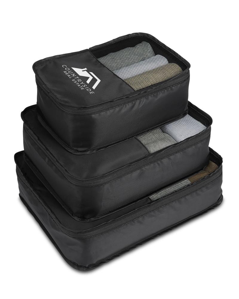 420D polyester; With three sizes to accommodate all your packing needs, these travel cubes ensure efficient use of luggage space while keeping your belongings neatly organized and easily accessible; Includes one small (8.3"w x 11.8"l x 4.7"d), one medium (11"w x 13.8"l x 4.7"d) and one large cube (11.8"w x 15.75"l x 4.7"d); nests into each other for easy storage; Mesh window to allow easy identification of your belongings while allowing them to breathe; All three cubes available to decorate for additional cost.