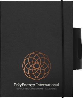 Recycled, wraparound paper covers available in EcoBlack and Natural. Includes 1-color foil or blind deboss imprint up to 16" sq. Refillable NotePad with 100 sheets 60# ruled, blank, graph, or dot grid paper. Pewter wire binding. Includes penholder with black elastic privacy closure